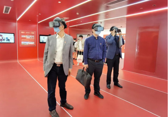 与会人员重点参观9F数字化党群服务中心,体验5G智慧党建墙在线更新的中央党校、学习时报课程,以及数字化党建互动装置——VR眼镜,体验“红军过草地”等革命场景。