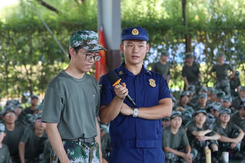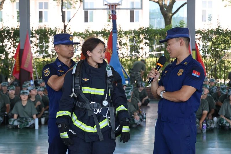 9月17日,浙江越秀外国语学院的军训场上多了一抹“火焰蓝”——消防安全教育活动来到校园,为2025级军训新生上了一堂“热乎”的安全课。
