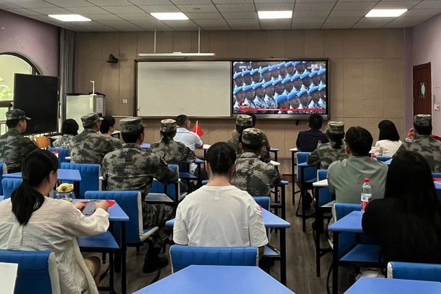 教官队组织在校队员集中观看阅兵仪式直播,其余队员线上同步。屏幕内外,同一面旗,同一片心。他们心潮澎湃,为国家力量的强盛而激动不已,为强军事业的成就感到无比自豪。