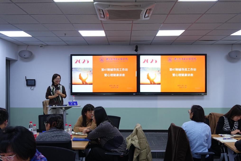 11月20日下午,我校第九届生命文化节之心理健康专题讲座在镜湖校区教师发展中心顺利举行。浙江工业大学心理中心主任王慧、学生处副处长杨勤、各二级学院学工书记、学工办主任、心理辅导站负责老师以及学生工作一线教师代表共同参加。