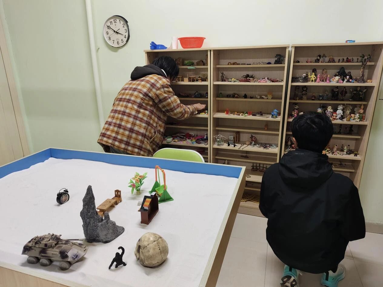 在轻柔的背景音乐中,同学们缓缓走入布置温馨的沙盘室,面对两架精心准备的微缩模型与沙箱,逐渐放松身心,进入与自我对话的状态。有人轻轻抚沙,有人静静挑选小人、树木、动物或建筑,逐步在沙盘中构建属于自己的“心灵庭院”。